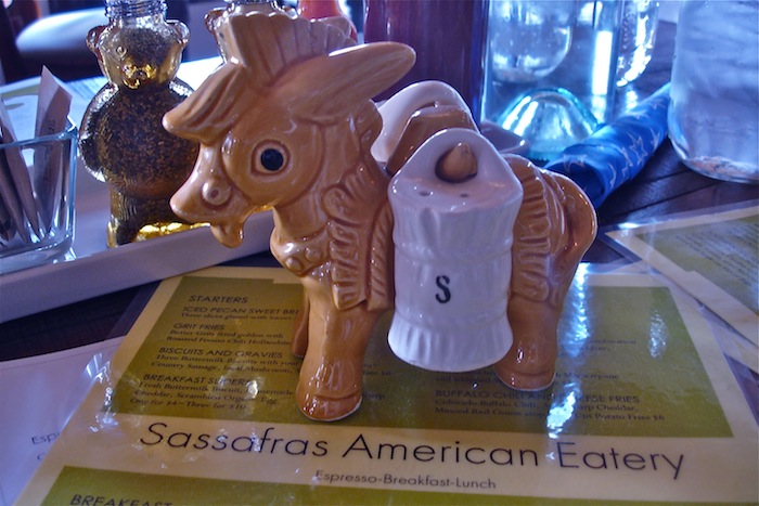A friend recently opened a breakfast and lunch eatery – Sassafras (2637 W 26th Ave Denver) – not too far from our digs and it has quickly become our new favorite brunch destination. Not only is it off the beaten path in a Victorian house turned restaurant with all the stylings of dining at a friend’s home (long farm tables, cozy patio, and ooh check out the wood plank ceiling) it serves up delicious southern inspired eats using local ingredients. My favorite part of the experience (besides the yummy food and shakes) are the personal touches: homemade cloth napkins, the wait staff’s bright floral aprons, and each table has a unique pair of vintage/collectible salt and pepper shakers – subtle and functional decoration. Brilliant!